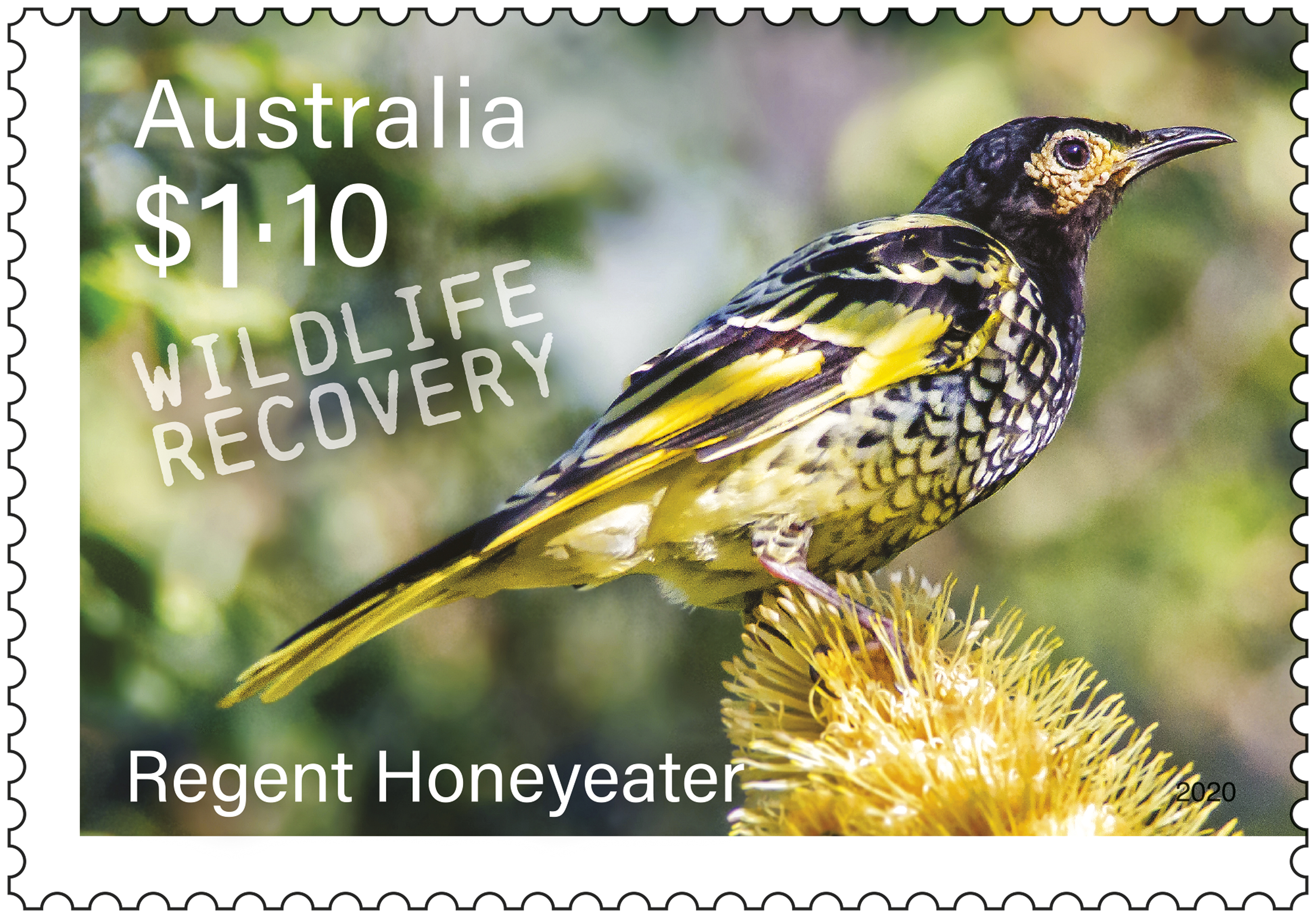 The Regent Honeyeater (Anthochaera phrygia) is a striking bird, with a black head and neck, lemon-flecked back and breast, and deep yellow wing patches and edge to its tail. This gregarious honeyeater traditionally occupied eucalypt woodlands in eastern Australia from Rockhampton to Adelaide, but its territory has been significantly reduced through the loss and degradation of its habitat and competition from aggressive species such as the Noisy Miner. This honeyeater is now present only in New South Wales and Victoria, where it is especially associated with the western slopes of the Great Dividing Range, an area affected by the bushfires.