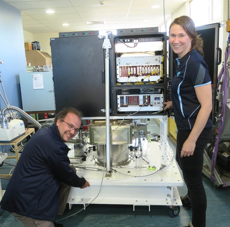 CSIRO astronomers Dr George Hobbs and Dr Jane Kaczmarek with the receiver.