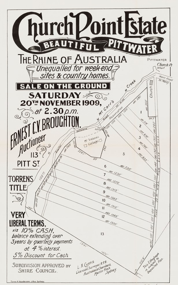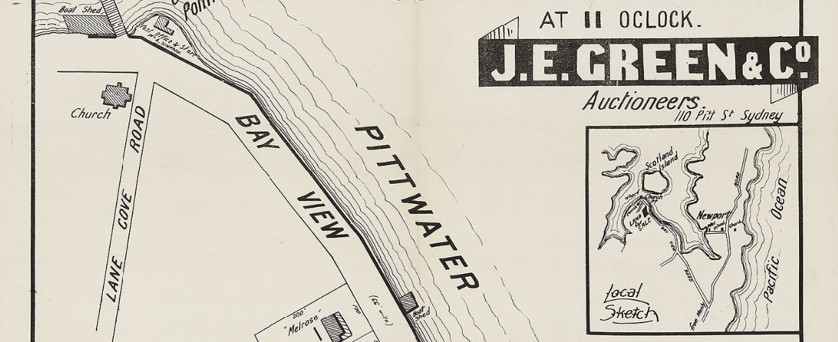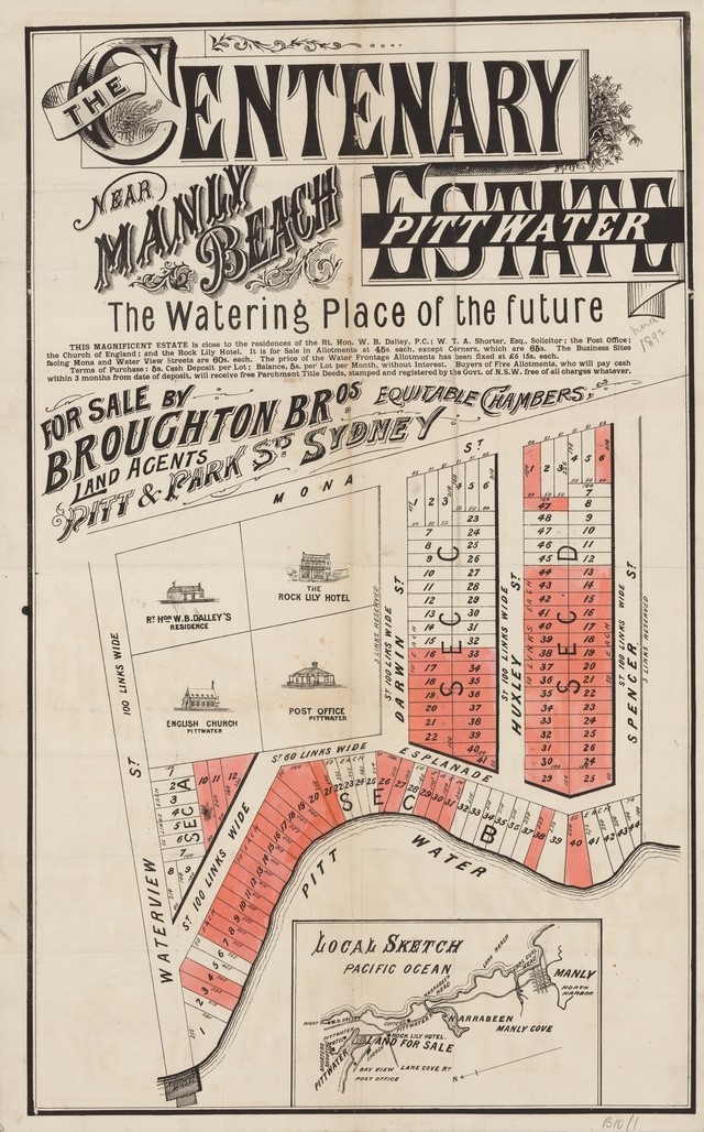 HARDIE and GORMAN have received instrnctions to sell by public auction, at their Rooms, Pitt-street, at 11.50 o'clock, WEDNESDAY, 20th September, 100 acres of land at Pittwater, the choicest spot In the whole district, and which was selected by the present owner as a site for a residence. Advertising (1882, September 7). The Sydney Morning Herald (NSW : 1842 - 1954), p. 15. Retrieved from http://nla.gov.au/nla.news-article28376790