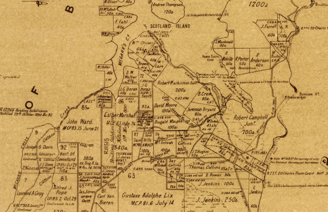 On 1 January 1841 William Timothy Cape leased McIntosh’s 200 acre grant at present Bayview to John Johnson for £20 per annum. [LTO Book V No.569] John and Charlotte Johnson were living there, with three children, at the time of the 1841 census. They were still there in 1845, when John Johnson, Peter Duffy, and Daniel Bullock were all named as being associated with illegal distilling at McCarr’s Creek. The three were all married to Oliver women.