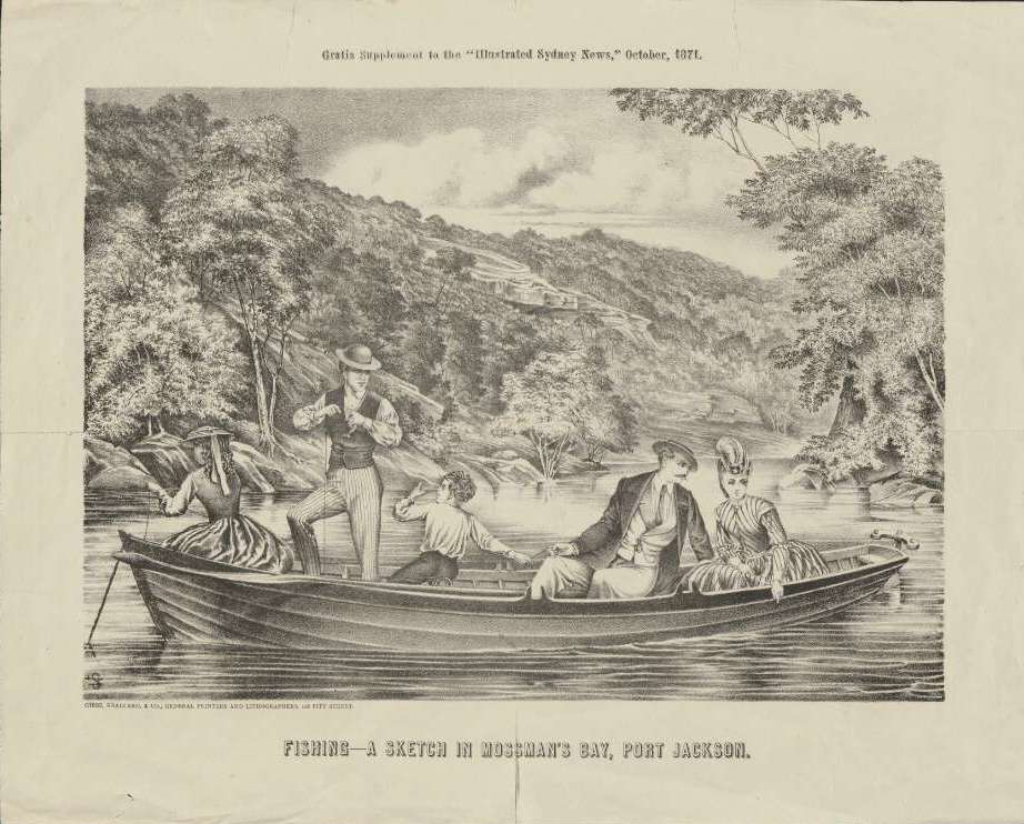 Published Sydney : Illustrated Sydney News, October 1871 nla.obj-133181941-1 - at: FISHING—A SKETCH IN MOSSMAN'S BAY, PORT JACKSON. (1871, October 28). Illustrated Sydney News (NSW : 1853 - 1872), p. 1 (Supplement). Retrieved from http://nla.gov.au/nla.news-article63618362