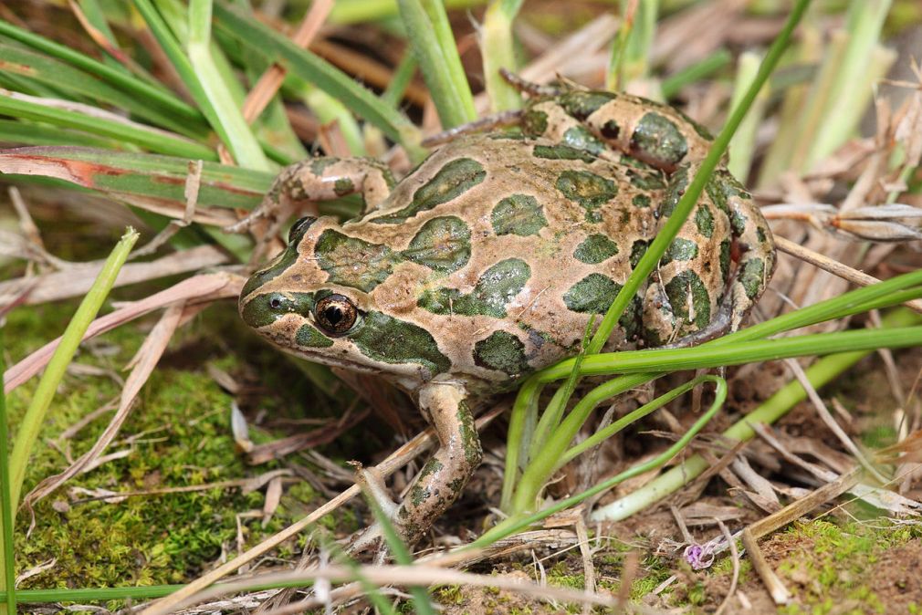 The Giant Burrowing Frog is a large slow-moving frog growing up to 10 centimetres in length. Its slowness makes it very vulnerable to predators. It gets its name from its oversized feet and muscular back legs which it uses to dig down into the earth and build burrows for breeding.
