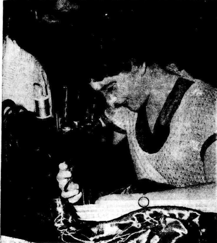 Miss Jean Samson saved a man from drowning and then walked off the scene as if it is part of her day's job. Here she is at her real job-as a machinist in a well-known tailoring shop.