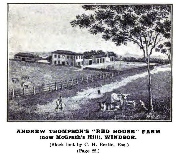 Amongst the pioneers of Windsor none is so familiar to local residents as Andrew Thompson. He was born in Scotland about the year 1773. His parents were of the poorer class, his father being engaged in a small business. When 16 years of age he was transported to New South Wales for setting fire to a stack of hay, and arrived by the ship "Pitt" in the year 1792.... On arrival, he was appointed to the stone gang at Parramatta, where he probably remained for a few years. We first hear of him at the Hawkesbury early in the year 1800, when the population was very small, as a settler and constable. At a meeting of settlers held to fix the price of stores and labor, at the Hawkesbury in the year 1800, Andrew Thompson was amongst those present, also D. Smallwood Edward Robinson, and M. Lock.
