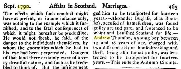 ‘John Aitkin…failing to Compear…[was declared] to be an Outlaw…Andrew Thompson…present…answered that he was Guilty… The Advocate Depute declared that on account of the Pannell’s youth and his former good Character and some other circumstances he restricted the libel to an arbitrary punishment…[At] and assizes…[21.9.1790] the said Andrew Thomson [was found] Guilty [10 of the 15 jurymen were Merchants]…[on 22.9.1790] The Lord Hailes…[declared] the …Pannell to be Transported beyond Seas to such place as his Majesty [decreed]…Council has appointed…that for the space of Fourteen years with Certification to him that if after being so Transported he shall be found at large in any part of Great Britain during the foresaid space without some lawfull Cause…he shall suffer death.