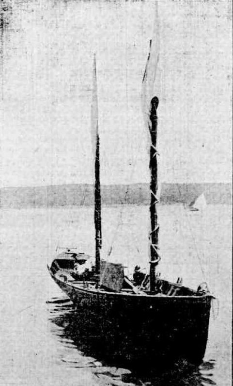 The J. S. Poyen, Junior, was built in New York, in the eighties, for racing purposes, on Lake Erie, and was shipped to Sydney to Mr. Jewett, who afterwards owned the Langford built Mabel. The Poyen was a beamy centre boarder, and carried a big spread of canvas. Her appearance here created a great deal of interest, and she is said to have been the only American yacht that has raced in our waters. Her best performance was in a race to Wollongong and back that Dr. Milford was responsible for. One condition was that each competitor should tow a dingey, which, as may be imagined, caused trouble. The Poyen, Assegai, Sao, and Water Nymph were started from Farm Cove about dusk one Friday. A big sea was running outside, and the Sao, having carried away her bowsprit, returned to port. The. Assegai lost her dingey off Botany but her owner continued the race, expecting that the other boats would meet with a similar experience. She was the first to round the mark off Wollongong about dawn. The Water Nymph overran the mark, and brought up off Kiama. So far it had been a run before a nor'-easter, which increased in strength as the day wore on. The Assegai had the best of the beat up the coast, but the wind left her off Botany, and she rolled and pitched in the heavy sea for a couple of hours. The owner deemed it prudent to replace his racing sails with a trysail in view of a coming southerly, which brought the Poyen up to her, and they both reached South Reef together, where the wind again failed. It was in the early hours of Sunday morning that the Assegai finished first, with the Poyen a close second; but the latter had her dingey still in tow, and was awarded he prize. There seems to be no reliable report of the race in print, and those who were on board the yachts give rather different accounts of the race, due no doubt to the night work, and the fact that they saw very little of each other during the day. The Poyen was not a successful boat in other matches, and she was eventually taken to Brisbane, where, after having been washed into the Botanic Gardens during a flood, she became an oyster boat.
