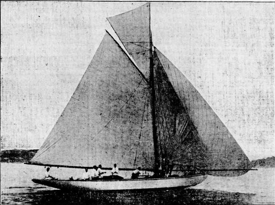 The Thelma was the best of the bunch. She had been built by George Ellis to Mr. Reeks' designs, and for model, build, and good taste was all anybody could wish for. Both her former owner, Mr. J. F. Hoare, and her present. Dr. MacCormick, scored many wins in her, and although she has been relegated to the cruiser class, she has still a wide circle of admirers, some of whom are sufficiently infatuated to contend that, if she were only tuned up, she could bring home the Sayonara Cup. The Archina, yawl, was built by Dudley. She was a better cruiser than a racer, and visited both the Derwent and Port Phillip. The Bronzewing, one of Mr. Sam Hordern's many boats, like her principal rival, the Bul Bul, was of British design, and those two boats are responsible for breaking up the racing of the local class of 'twofers,' which had been built under a different rule. The Iolanthe was imported from Scotland, and her many contests against the Sao, the Assegai, and, later, the Herreschoff, all about the same size, were particularly interesting. Mr. Cameron's Iduna, 28 tons, was a fine comfortable cruiser, with a turn of speed.