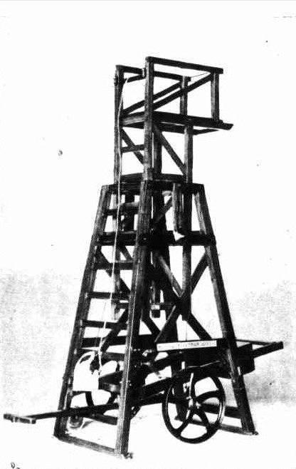 To bring the wheels on to the sand, so that the tower can be moved to another part of the beach, the main uprights at the back are hinged a couple of feet from the bottom, but when stationary this portion is kept firmly in position by iron bolts, which can be easily drawn. In front there is a pole with a cross-bar for the purpose of pulling it. The pole is close to the ground, and when the tower is to be moved the rear part on the hinges falls back, the machine rests on the wheels, thereby raising the front portion sufficiently to keep it clear of the sand while being moved. An alarm bell is at the side, to be rung when anyone is in difficulties and assistance required. In addition to keeping the line clear of the crowd the machine will enable the men working it from the tower to keep the belt man in view all the time, and thereby prevent the line being drawn in before he has reached the person in danger. It is also claimed that the line being manipulated from a height will be of considerable advantage in lifting rescuer and rescued up when being pulled in. The box at the rear has the line coiled in it, which the inventor considers is preferable to having a reel, on which the line frequently tangles, thereby necessitating a man always being at the brake when in use. A reel, however, can be attached if preferred. The model can be seen at Cole's Book Arcade in George-street.
