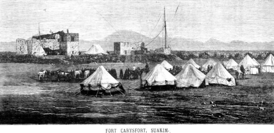 'Zareba No. 1, six miles from the left water fort, was reached at 9 a.m., and the force halted until 10.15 a.m. to rest the men and enable them to take food. During this time arrangements had to be made for the occupation and defence of the zareba, at which were left the 28th Bombay Native Infantry and two Gardner guns, manned by the Royal Marine Artillery. The balloon was filled and made ready for use for reconnaissance purposes. The force was joined by the Grenadier Guards, the Berkshire Regiment, the 24th Company Royal Engineers, and two Gardner guns, Royal Navy ; and by the Mounted Infantry and one troop 9th Bengal Cavalry, which had reconnoitred towards Tamai on the previous day.'