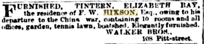 Births. On the 29th instant, at her residence, William street, the wife of Francis Hixson, Esq., R.N., of a son. Family Notices. (1862, July 31).The Sydney Morning Herald(NSW : 1842 - 1954), p. 1. Retrieved from http://nla.gov.au/nla.news-article13232077 - Francis William