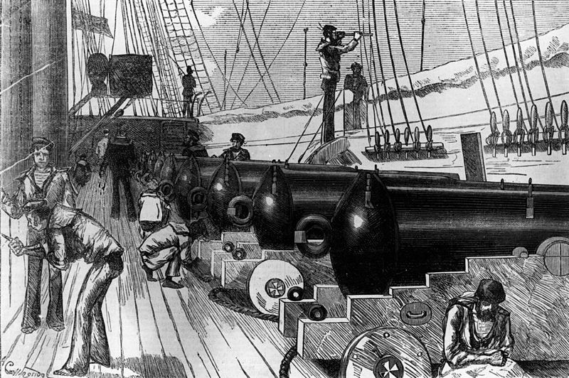 Gun deck of H.M.S. Wolverene, 1881. Copy of an illustration from the Town and Country Journal, 11th of June, 1881 p.1128. Artist's name Colleridge?.