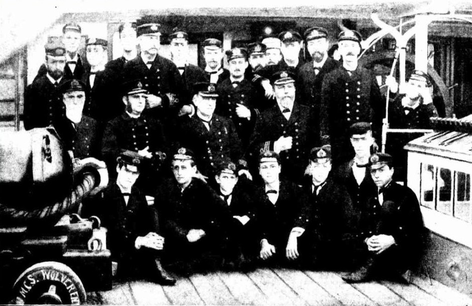 The Ajax was commanded by Captain Cross, under whom were Lieutenant Gardiner, Midshipman Cross, Cadet Hickson, Dr. Baker, and Gunnery-instructor Dagwell. On the Captain Cook the officers were Lieutenant Lewington (in command), Sub-lieutenant Cohen, Midshipman Church, and Cadet Dawson, Lieutenant Commander R. N. Arnold was m charge of the Juno, and Lieutenant Les was in command of the Neptune, and each vessel was fitted up and armed in the manner described in the Herald several days ago. The Wolverene carried 14 guns, seven on each side a Gatling gun in the main-top, and two stern chasers, and the Ajax and the Captain Cook each carried two broadside guns and one stern-chaser. The Naval Brigade had had two drills in harbour on board the Wolverene, but it was not until Saturday afternoon last that they put to sea in her. At 3 pm the main contingent mustered at the horse ferry, Fort Macquarie, and, after waiting half an hour for stragglers, the tender conveyed the brigade to the Wolverene, which, was lying at her buoy in Farm Cove, with steam up ready for a start. While the men and their kits were being got on board a few additional members of the Brigade came hurrying up in a small boat and were only just in time to join their comrades, for shortly after 4 o’clock the Wolverene slipped her moorings and put out to sea, steering southward.