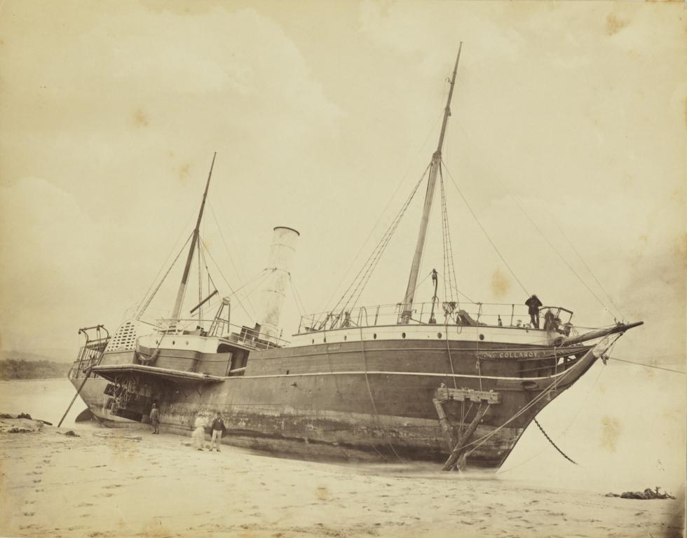 Wreck of the S.S. Collaroy, 1881 / photographer unknown. State Library of NSW Image No: a1528938: A passenger steamer owned by the Australian Steam Navigation Company, built in 1853, went ashore on Collaroy Beach in 1881 and remained there for 2 years, giving her name to the stretch of sand and ocean. When refloated she went back into service plying between Sydney and the Hunter River. She was withdrawn from duty in 1886, converted to a schooner, sailed to San Francisco, where she again ran ashore and broke her back on the Californian Coast in 1889.