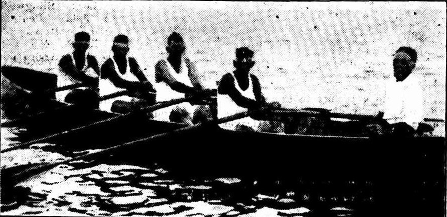 From left to -right: E. Ellem, E. Doust, A.. Bender, C. Ellem (stroke) and C. Paine (cox).' Winners of the Open 'Butcher B0at Handicap, and second in the Maiden Buteher Boat Handicap at Grafton. They were also first in the Second Division of the Open Butcher' Boat Handicap and second in the final of the same event at the Maclean Regatta.