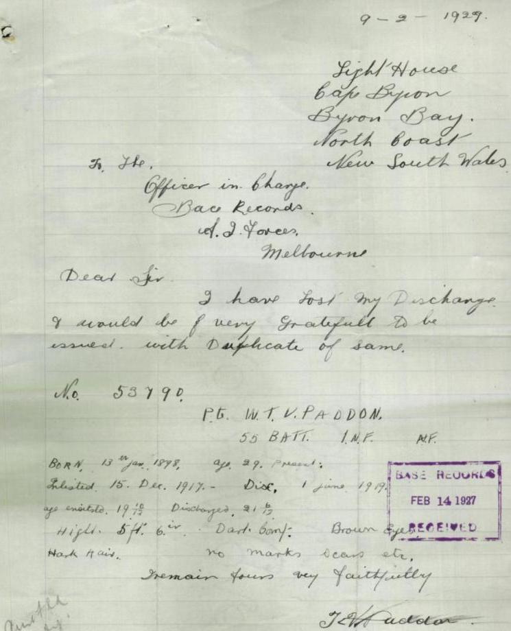 William T V Paddon returned to the Northern Rivers area, and went into a solitary life in Light-keeping. A letter with a return address of Cape Byron Lighthouse, requesting information from 1929: