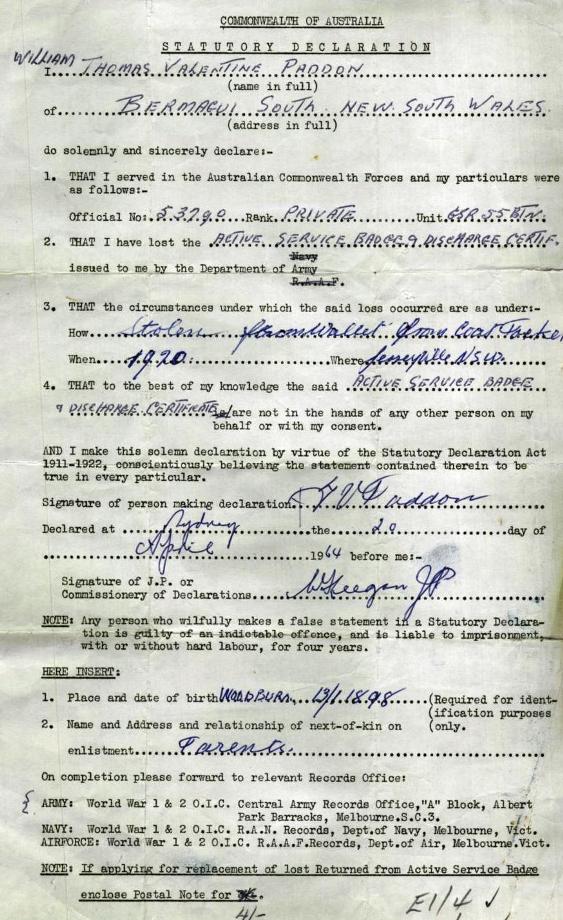 William T V Paddon also served in WWII: PADDON THOMAS VALENTINE : Service Number - N380405 : Date of birth - 13 Jan 1898 : Place of birth - WOODBURN NSW : Place of enlistment - BERMAGUI SOUTH NSW : Next of Kin - PADDON AMELIA - retrieved from National Archives of Australia.