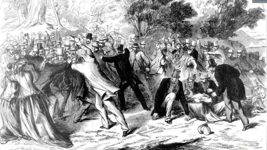 Before his Royal Highness could reply a treacherous assailant, who had just left the crowd of persons congregated under the shade of the trees, stole up behind him and when he had approached to within five or six feet pulled out a revolver, took deliberate aim, and fired. The shot took effect about the middle of the back of his Royal Highness, an inch or two to the right of the spine. He fell forward on his hands and knees, exclaiming," Good God, my back is broken."
