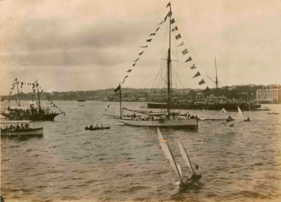 Above: Prince Alfred Yacht Club Regatta - 1895 (?) - Bronzewing and Althea (steamship in background) with yacht. BRONZEWING on the day and was accompanied by the flagship ALATHEA. courtesy ANMM Collection 00019553