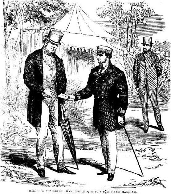 H.R.H. PRINCE ALFRED HANDING CHEQUE TO SIR WILLIAM MANNING. THE RECENT ATTEMPT ON THE LIFE OF His Royal Highness THE DUKE OF EDINBURGH. (1868, April 20). Illustrated Sydney News (NSW : 1853 - 1872), p. 1 Supplement: SUPPLEMENT TO THE ILLUSTRATED SYDNEY NEWS. Retrieved from http://nla.gov.au/nla.news-article63513927