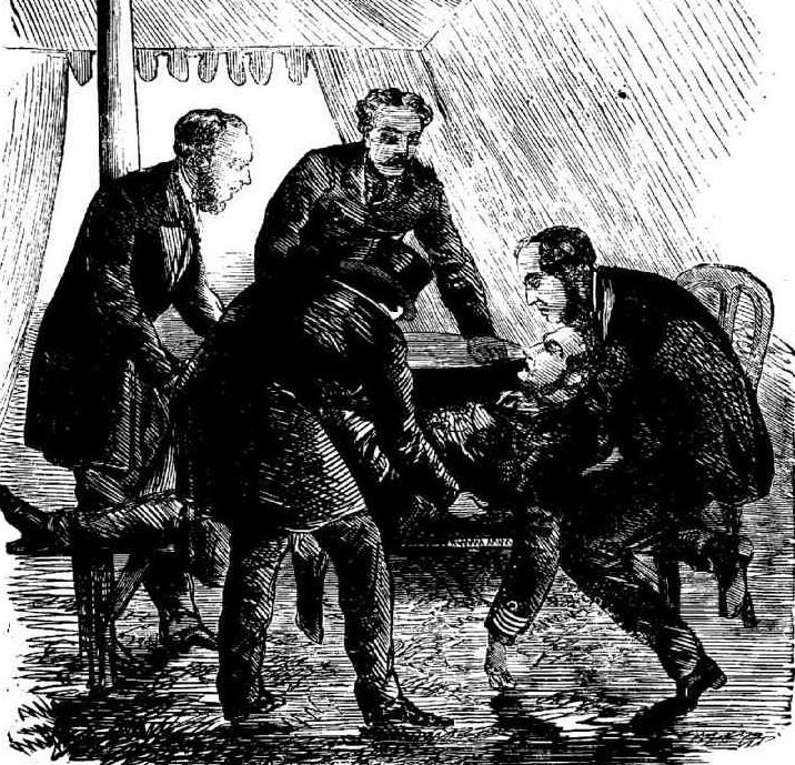 The effect of this dastardly attempt at assassinating the Prince, among the immense number of persons congregated at Clontarf, may be more easily imagined than described. A large number of ladies fainted, others were seized with hysterics, and the whole multitude was convulsed. Suddenly a joyous throng had been converted into a mass of excited people, in whose breasts sympathy for the Royal sufferer, and indignation for his murderous assailant, alternately prevailed; while pallid faces and tearful eyes told of the deep anxiety that was felt in reference to the extent of the injuries which his Royal Highness had sustained. People crowded by hundreds around the tent in which the sufferer lay, until they were informed that they must keep back, in order to allow free ventilation; they at once fell back thirty or forty yards and formed a complete cordon around the tent, and anxiously awaited the result of the examination. Finding the people so anxious about him his Royal Highness said "Tell the people I am not much hurt, I shall be better presently."