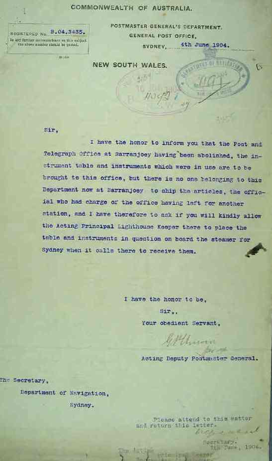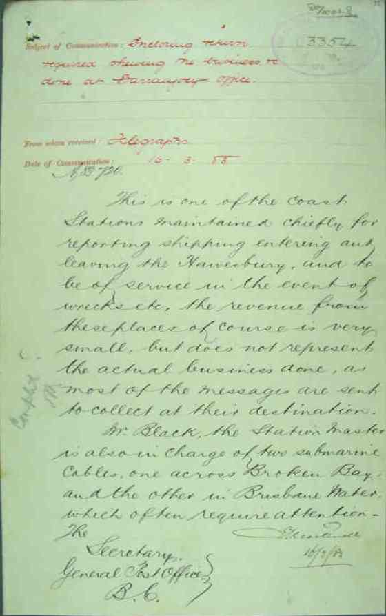 A Telegraph apparatus was established at Barrenjoey in the Customs Station in 1869, the first Telegraph Officer being Customs (waiter) Officer Albert Thomas Black - it's main purpose being, as stated then, "to record and report shipping entering or leaving the Hawkesbury Pittwater - and report any wrecks", as well as keep an eye out for any potential smugglers, although these had been curtailed since the establishment of the Customs Station. Many of the reports from Barrenjoey also referred to weather conditions - listing vessels in Pittwater and staying there for shelter