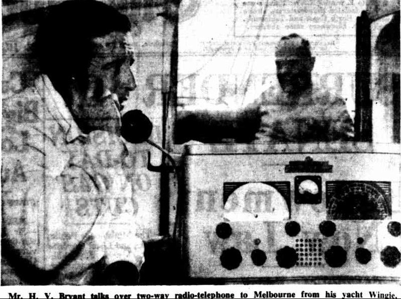 Mr. H. V. Bryant talks over two-way radio-telephone to Melbourne from his yacht Wingie, cruising off Sydney Heads. Mr. H. M. Lamb is at the tiller.