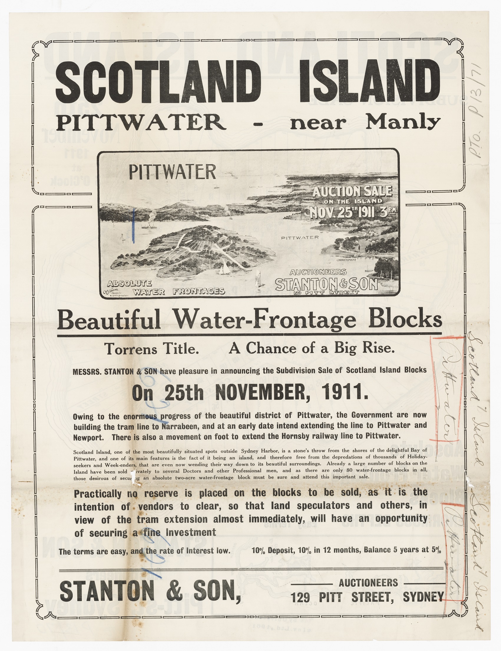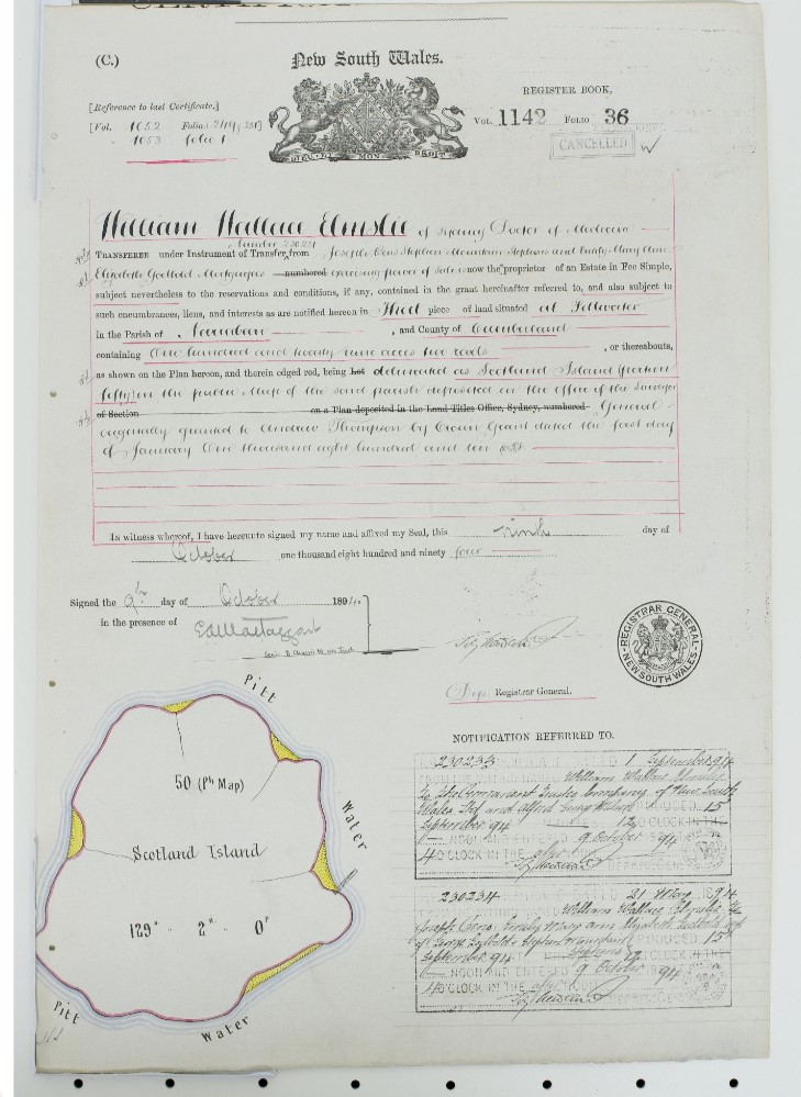 Certificates of Title were issued to Joseph Benns and Charles Jenkins on 8 February 1892 and they sold the island, which was onsold until the 1924 land sales under Herbert Fitzpatrick, with Mr. Ducker and family members as partners in Scotland Island Estates.