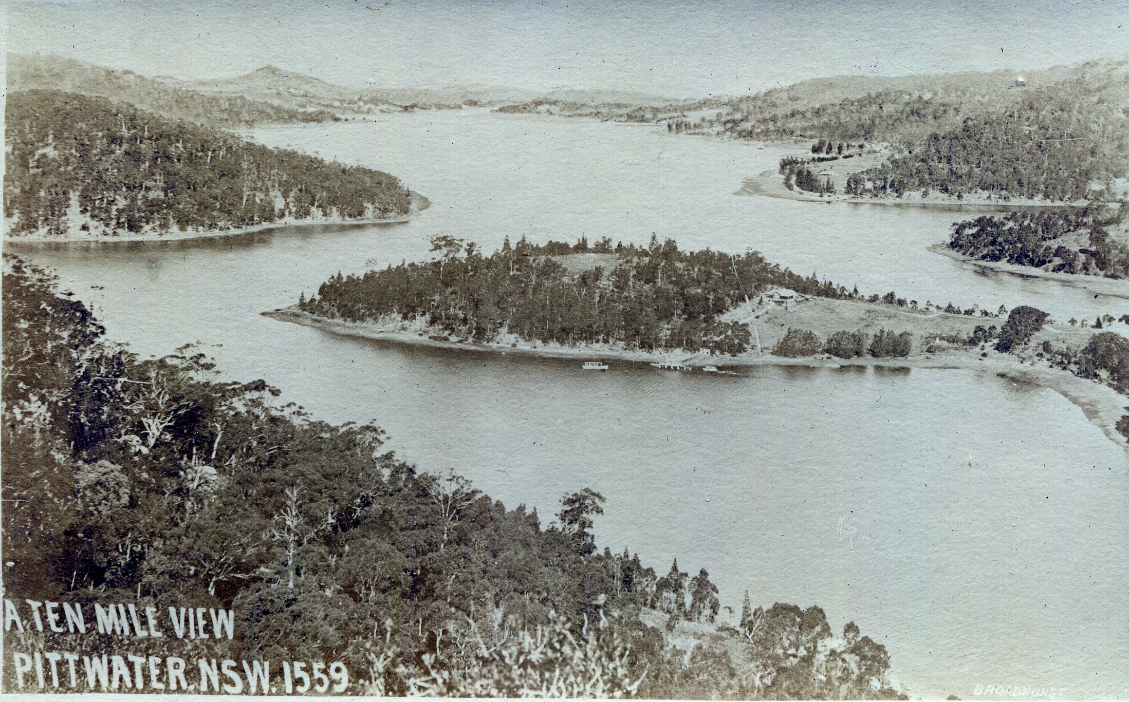 'Scotland Island, Newport, Pittwater, N.S.W.', photo by Henry King, Sydney, Australia, c. 1880-1886. and section from to show cottage on neck of peninsula at western end with no chimneys through roof. From Tyrell Collection, courtesy Powerhouse Museum