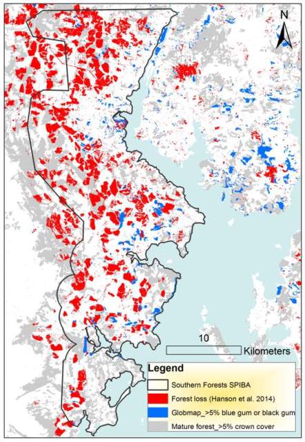 Above: Forest loss in Tasmania's Southern Forests Swift Parrot Important Breeding Area (SPIBA) between 200-2012 (red) alongside the remaining fragments of Swift Parrot breeding habitat (blue). Map supplied by Dejan Stojanovic