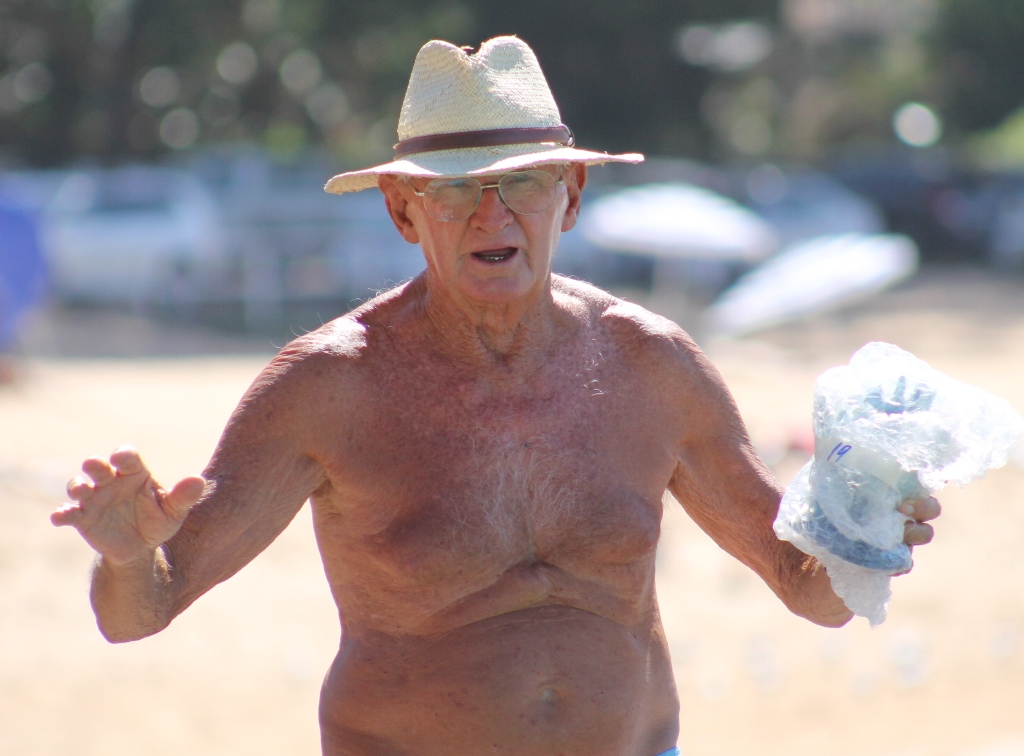 Mr Carter, now 82, has been on Palm Beach since 1947 when he commenced duties as a Beach Inspector*. He has been teaching children swimming and surf skills for 65 years. The gent who taught Kerry and Ros Packer to swim, then Jamie, “They’ve been very good to me,” often sees succeeding generations of children brought by their parents to learn from one of the best. Watching him on Thursday shake the hand of each boy swimming and kiss the top of the head of every girl before their racing is seeing a man’s love of his students.
