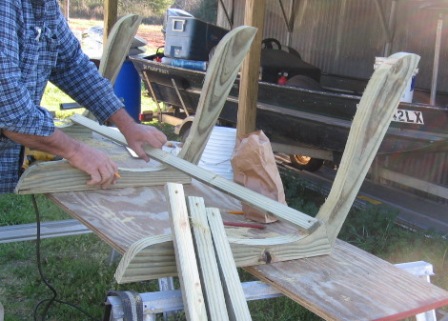 It’s a good idea to tack these on temporarily to get your spacing to worked out uniformly prior to attaching them permanently. Attaching the top-most back slat and front-most seat slat first before filling in the others might make it easier to keep your frame square. Take care to use the thicker strips for the seat, and the thinner slat strips for the back.
