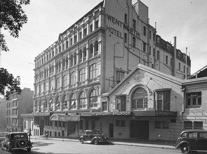 Above: Hood, Sam, 1872-1953 Title Dancers on the floor of the ballroom of the Wentworth Hotel at the McRae Knitting Mills' Ball , Date of Work 19/6/1937. Pic No.: 08382r. Below: The Wentworth showing the Ballroom entrance, from Hood, Sam, 1872-1953 Title The Lang street facade, before it was painted white, Wentworth Hotel (Brewster & Manderson, architects) Date of Work 8/1938 Pic No.: 09504r. Both Pictures are Courtesy the State Library of NSW