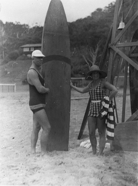 Left to right. Miss Sue Russell, John (Jack) Ralston PBSLSC withAlrema Samuels (nee Becke) on right circa 1934-36 with 9 foot surfboard. Image No.: hood_02985, and below: hood_02978h. Titled 'Man and woman with 9 foot wooden surfboard' - Jack and Norah again. Both courtesy State Library of NSW