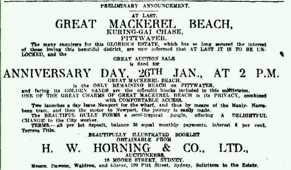 PITTWATER. ALBERT EDWARD HEATON.-100 yards, Parish Narrabeen, on the southern side of Pittwater, about 100 yards easterly from the Government Wharf, fronting Ben Crew's portion No. 20 of 80 acres. Advertising. (1904, May 4). The Sydney Morning Herald(NSW : 1842 - 1954), p. 4. Retrieved from http://nla.gov.au/nla.news-article14617398