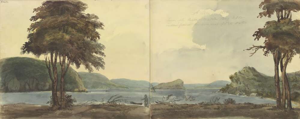 Baranjuee, the south head at Broken Bay, is also the eastern head of Pittwater. It is a small peninsula of tall cliffs connected by an isthmus of low and tolerably fertile land with the hilly county which separates Pittwater from the sea. Pittwater is not unlike Port Jackson in its general features, and extends for about ten miles to the southward, branching off into a number of picturesque bays and coves. There are few habitations on the banks of this estuary, these few are situated near its head. Several small houses may be seen, which have been inhabited by men employed in the production of Lime but which have been abandoned in consequence of the supply of shells having become exhausted. Near the head there is s small island, which contains a number of fruit-bearing peach trees, the remains of former cultivation.