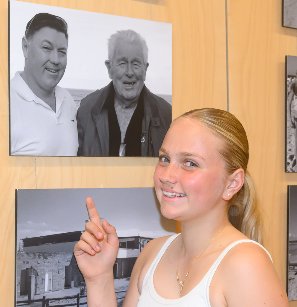 Tilly Rose with a portrait of her dad and his dad that is housed in Mona Vale SLSC clubhouse