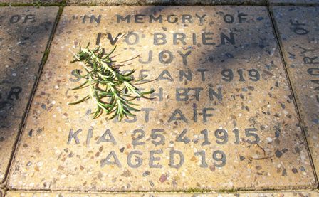 Spurred on by Ataturk the Australians suffered ever increasing losses, including that of inspiring leader, Lt Mort Reid (with a broken femur). Facing annihilation, they had to fall back on Baby 700 where Lance Sergeant Ivo Joy was severely wounded, shot through the chest region. Following desperately heavy fighting on both sides of Baby 700 later that day and evening, our troops had to fall back onto Popes Hill and The Checkerboard, leaving some of their wounded hopelessly behind. Ivo Joy, his body never found, was amongst some 3000 Australians that fell who have no known grave, their bones mingled into the dust of the Gallipoli Peninsula, and lying there yet.