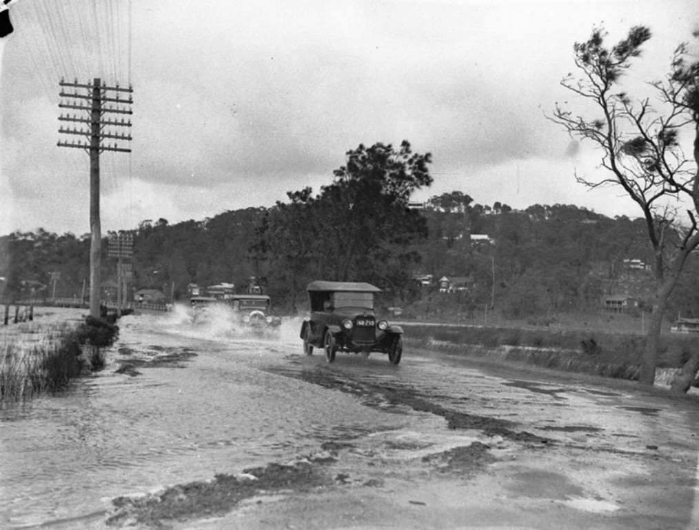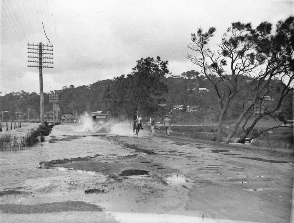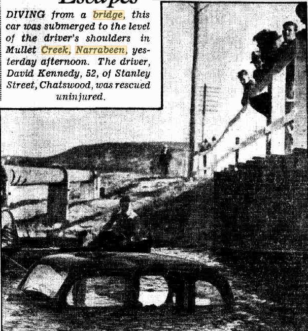 A man whose sedan car plunged from a bridge into Mullet Creek, Narrabeen, yesterday was rescued sitting at the driving wheel in water up to his neck. He is David Kennedy, 52, of Stanley Street, Chatswood. He was driving from Palm Beach to Manly along Pittwater Road. The car struck the western wing of the bridge, slewed across the road, and plunged through the wooden panelling on the opposite side. The car dropped six feet to the water, and sank to a depth of four feet, keeping upright. Saw Car Disappear George Robertson, of Jenkins Street, Crow's Nest, who saw the car disappear from 100 yards away, ran to the bridge. He saw Kennedy sitting in water up to his neck, and, clambering on to the top of the car, helped him to escape. Kennedy, who had small scratches on his nose, went home. He told the police that he thought he must have felt faint, for he did not remember the car striking the wing of the bridge. He recalled seeing the bridge rails ahead, as the car dashed towards the side, and then the icy water closing over him. Constable Turner (Narrabeen) is inquiring. Driver Escapes (1939, September 21). The Daily Telegraph (Sydney, NSW : 1931 - 1954), p. 5. Retrieved from http://nla.gov.au/nla.news-article247810804