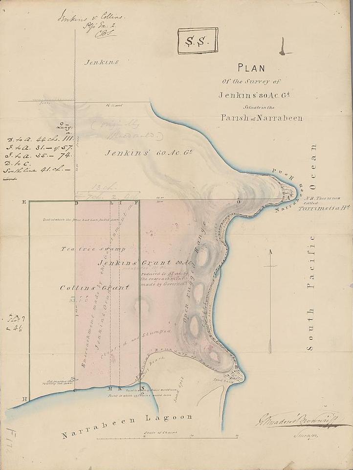 Right: Plan of the survey of Jenkins' 80 acre grant [cartographic material] : situate in the Parish of Narrabeen: 1831 - 1859. MAP F 172. by Brownrigg, W. Meadows (William Meadows), courtesy National Library of Australia