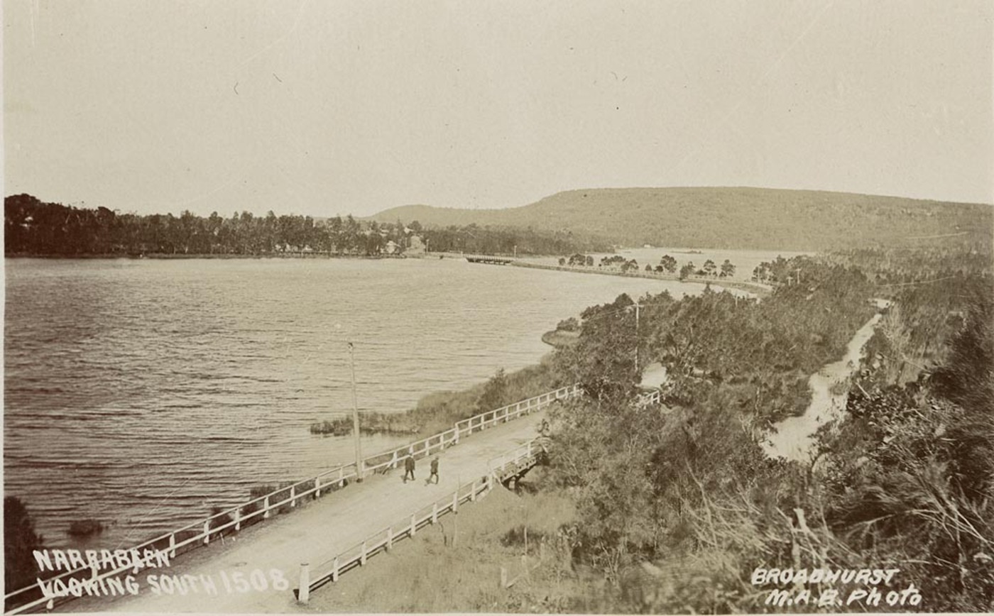 A glimpse through the trees towards the bridge at Narrabeen. THE BRIDGE AT NARRABEEN. (