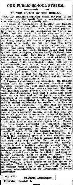 1. Francis Anderson, The Public School System of New South Wales, Angus & Robertson, Sydney, 1901; Craig Campbell and Geoffrey Sherington, 'A Genealogy of an Australian System of Comprehensive High Schools: The Contribution of Educational Progressivism to the One Best Form of Universal Secondary Education (1900–1940),' Paedagogica Historica, vol 42, no 1 & 2 , 2006