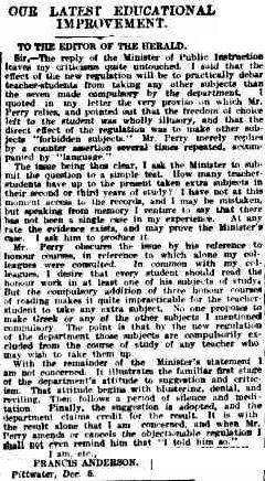 Reforms to education became one of this gentleman's life long missions. Education in Sydney prior to Francis Anderson was based on teaching a child by rote. The idea of a New Education, which would focus on developing a person's creative skills, based on a perception people learn more from engaging with material and working as teams, began to be shipped across the oceans from England. It was Francis Anderson who threw out the first challenge to the established order though. In his June 1901 Address to the Teacher's Association meeting expressed opposition to a system of teaching that adhered solely to systems and mechanisms or 'Neither the human spirit nor true learning was served by hundreds of children learning their geography like parrots' (1).