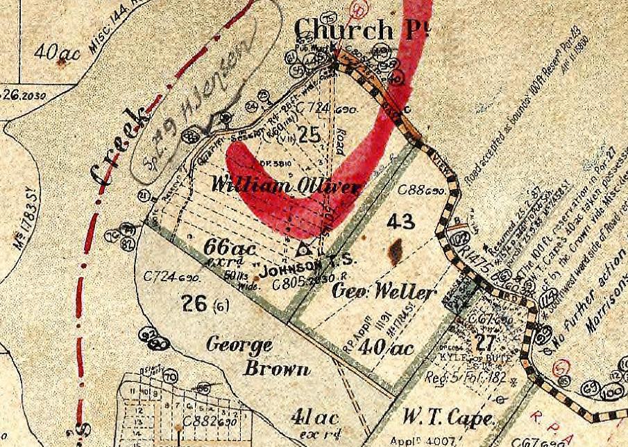 Next door, and over one block towards east in today's residential blocks settings, was the Church Point church, school and graveyard. The pathway up to Quarter Sessions Road as it is today, up the back of the church yard and God's acre, was the Reserve Road marked in Thomas Wilson's acreage on the other side of that current pathway.