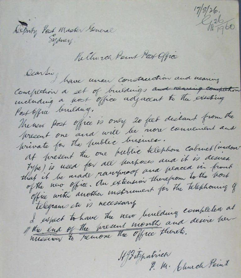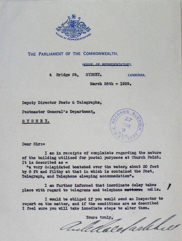 His efforts to rebuild were delayed by a Timber Workers strike. Both The Post Office Master General and Warringah Council made several inquiries during 1929 as to when this would occur, and although he had contractors to rebuild, at a cost of £2000, and furnished a drawing, Charles Frederick Wymark, filled the gap as Post Master.