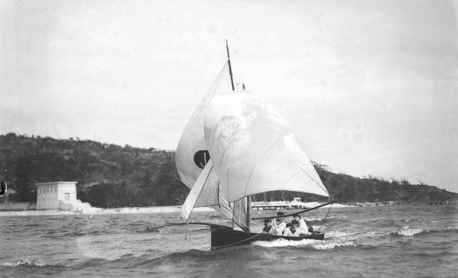 Portside view of a 16 footer, Sydney Harbour - ANMM IMage: 00002191, During the late 1880s and early 1900s, photographers William F Hall and his son William J Hall documented the weekend sailors and yachts of Sydney Harbour. Each Monday the images would be displayed in the window of their studio at 20 Hunter Street.