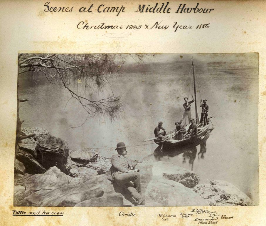 Scenes at Camp Middle Harbour ; Christmas 1885 & New Year 1886 - 'Tottie and her Crew"- ANMM Collection Gift from the Royal Sydney Yacht Squadron 00013762. This image belongs to a photograph album relating to Edward Hungerford. The album contains images of shipping and street scenes around Sydney from the 1880s, most of which appear to have been taken by photographer Charles Bayliss.