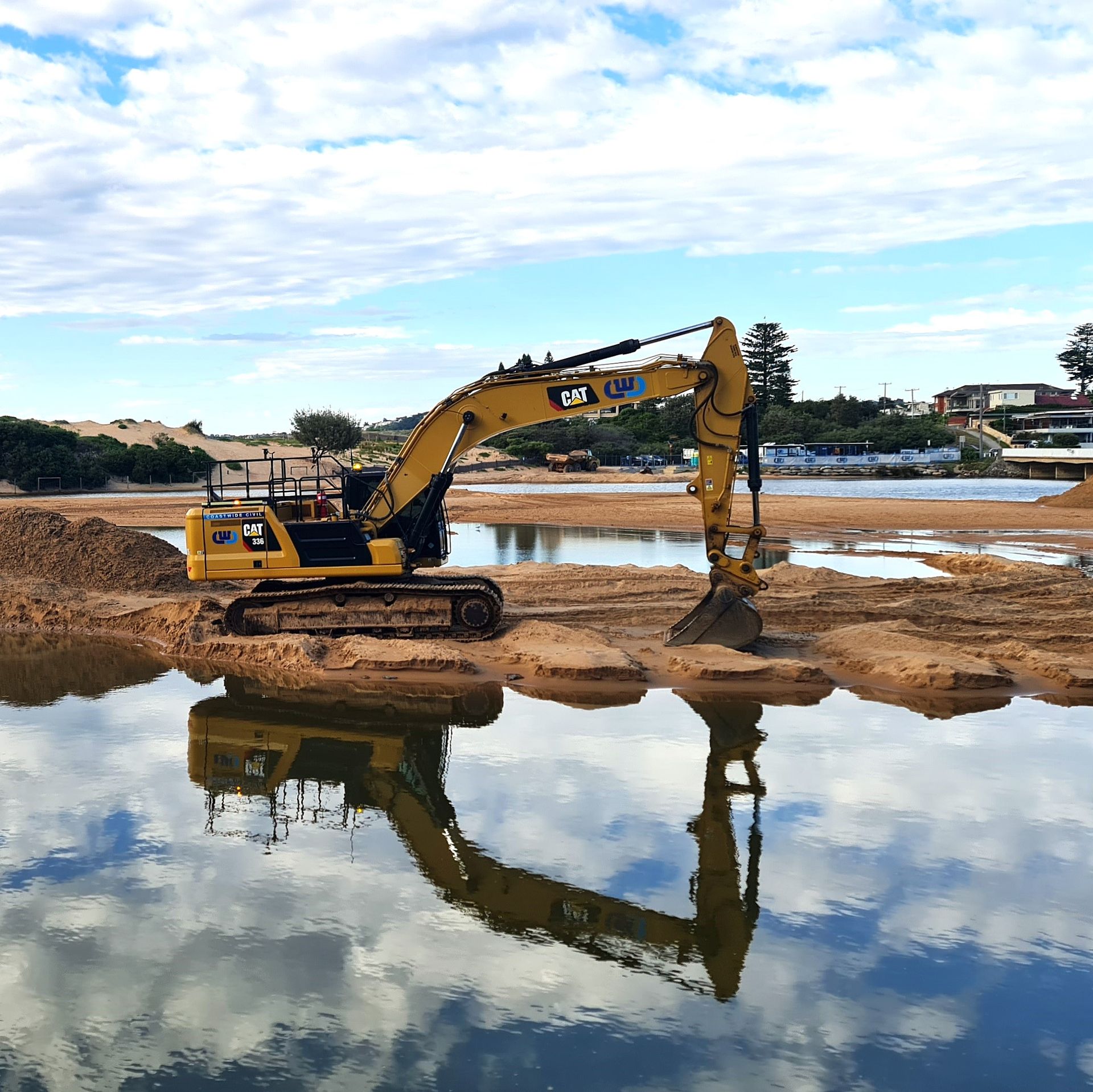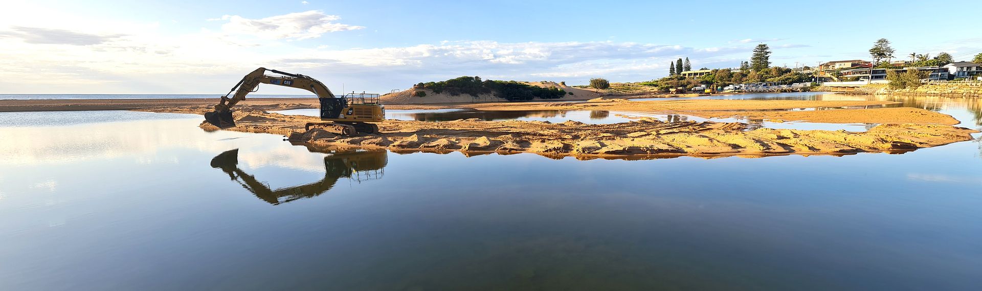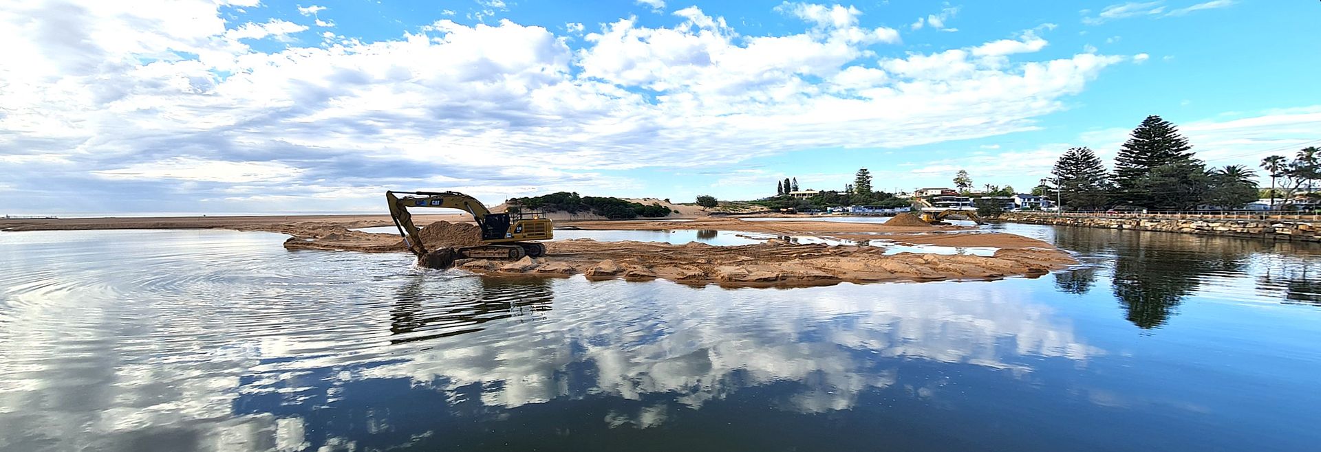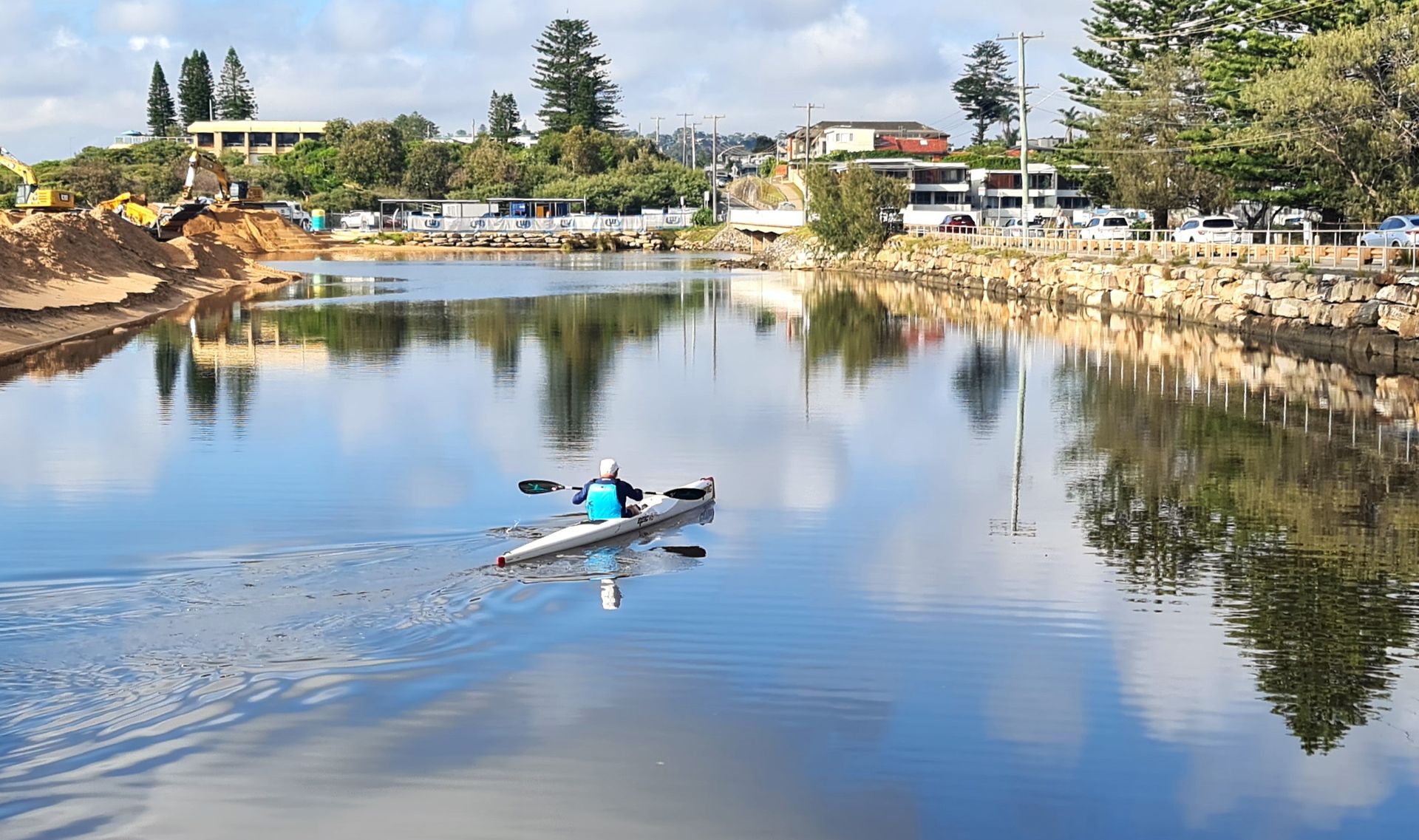 Narrabeen Lagoon entrance near bridge: dredging works and kayakers