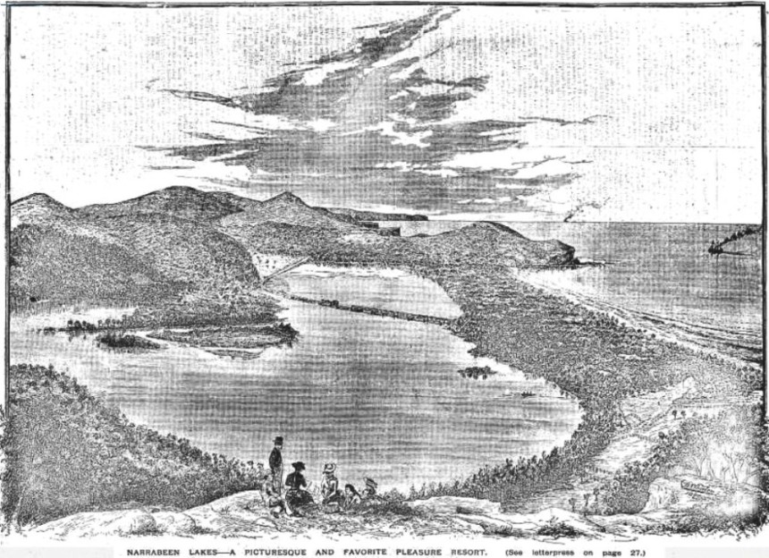 Above: Deep Creek, Narrabeen. Contemporary Journalism. (1893, November 25). Illustrated Sydney News (NSW : 1881 - 1894), p. 15. Retrieved from http://nla.gov.au/nla.news-article63672414 Below: Narrabeen Lakes, No.a116487, courtesy State Library of NSW