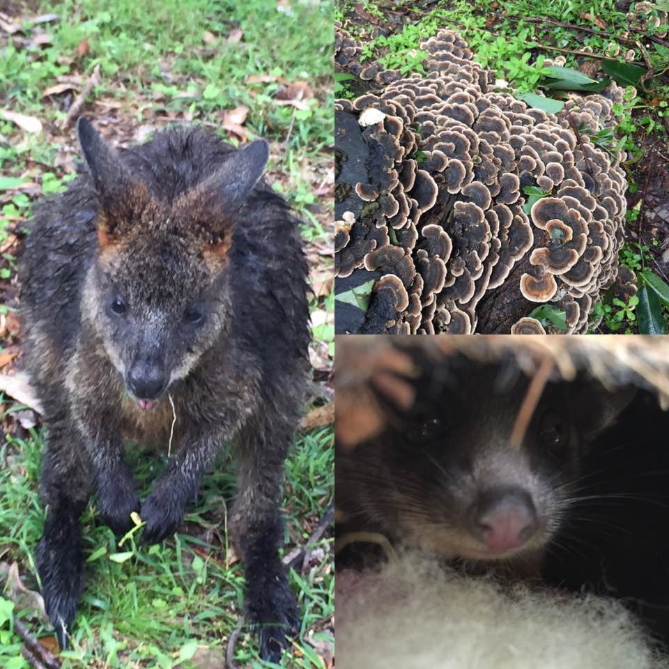 With the weigh-in complete, I decide with a heavy heart that my babies are ready to graduate. After a quick call to Joan, I hop in the car and drive the nest of babies up to Duffy’s Forest. Along the way I pick delicious foliage for the babies to add to their new aviary. I also stop off at Petstock to buy some more turtle food for the rehabilitating turtles up at the Facility. As I arrive, the heavens open. Yay… Not. Soggy wallabies bound around inside the paddock. Soooooo cute. Joan is attempting to catch a kookaburra inside one of the enclosures for a visit to the local veterinarian. His flight training isn’t going as well as expected so he needs a health-check.