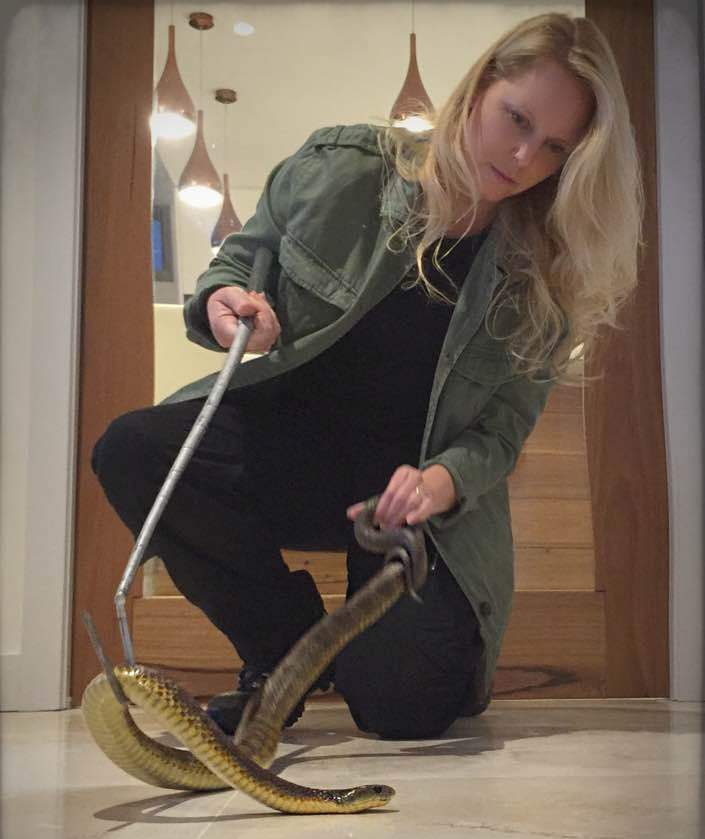 Georgie grappling with the 1.4m tiger snake. What a woman!